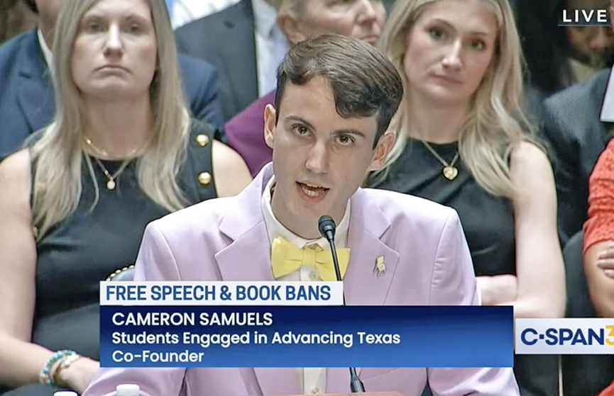 Cameron Samuels (they/them) is co-founder and Executive Director of Students Engaged in Advancing Texas, a movement demonstrating youth visibility in policymaking. With SEAT, Cameron has spearheaded grassroots opposition to anti-LGBTQ+ mandates in Texas school districts, introduced legislation to elevate student rights, partnered with the Biden-Harris Administration to center youth leadership, and testified before the U.S. Senate at a hearing on book bans.